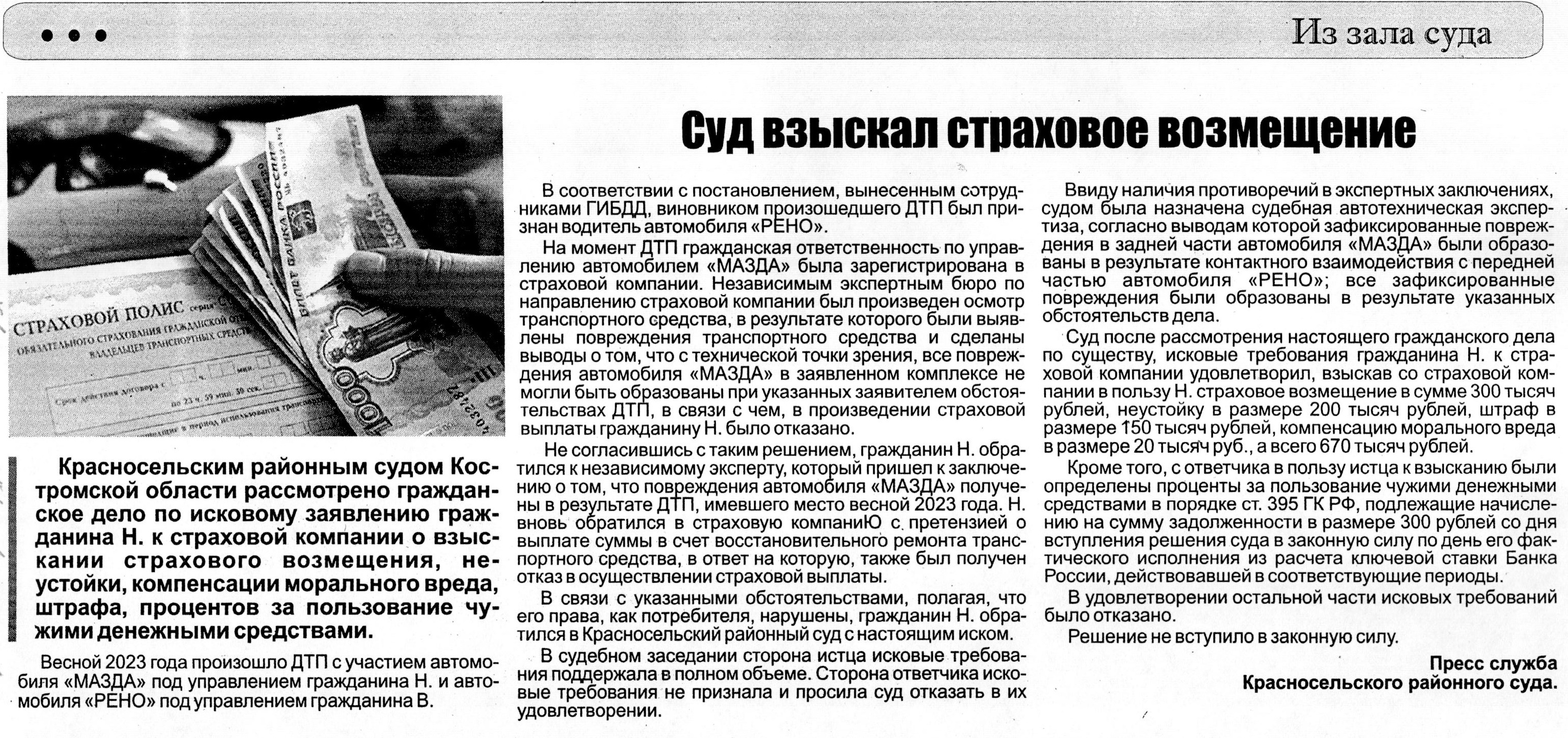 В газете "Красное Приволжье" опубликована статья "Суд взыскал страховое возмещене"версия для печати
