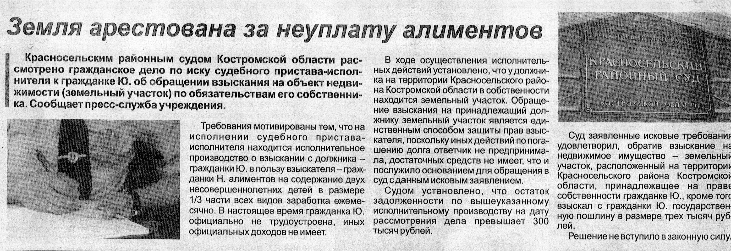 В газете "Красное Приволжье" опубликована статья "Земля арестована за неуплату алиментов"